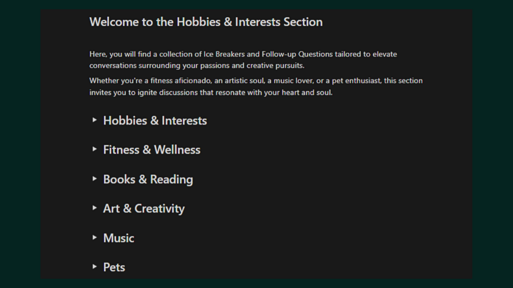 Spark engaging discussions with ease by tapping into common hobbies and interests.